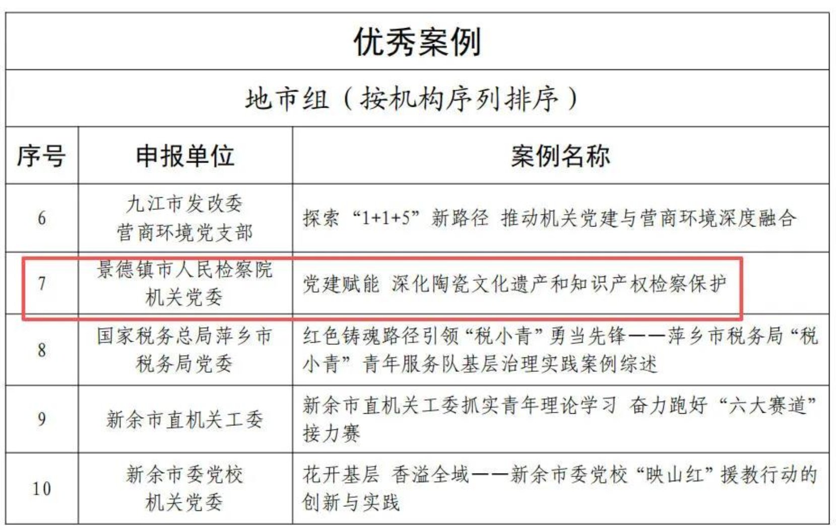 今年,省直机关工委开展了全省机关党建创新案例征集活动,面向全省各级机关党组织征集了一批机关党建工作的创新做法与工作经验,评选出最佳案例35个、优秀案例92个;优秀组织奖11个。经市直机关工委初选、省直机关工委复评,我院申报的《党建赋能 深化陶瓷文化遗产和知识产权检察保护》案例入选地市组优秀案例。